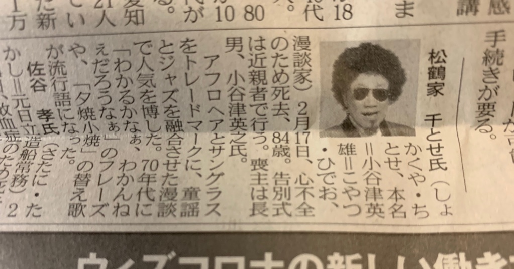 分かんねーだろうな…。松鶴家ちとせ 2022 2/20 演劇・映画 その他 2022.02.20 なにげに、物故者記事を読んでいて、昨年亡くなったお馴染みさんがなんと多いことか、感じ入るものがありました。 アフロにサングラス、今はスタンダード? この方は先日お亡くなりになりました。 日経より 漫談家、とありますが、漫才師とどう違うのでしょう。高校を卒業後、暫く地元の金融機関の窓口で働いていて、当時は高度経済成長期で社員旅行などありました。他局のお偉いさんが酒に酔って「漫談」を披露していましたが、みんな何も聞いておらず杯を酌み交わしているだけ。 どなたかご存知でしたらTwitter経由で違いを教えて下さい。 演劇・映画 その他 この記事をシェアする 残り野菜で観葉生活〜虫は怖いよ 高島秋帆墓所〜都会にひっそりと 関連記事 遠き落日〜我が息子よ 2022.11.26 山崎マリさんとネオレアリズモ? 2022.10.27 梅安ガンバレ豊悦 2023.03.19 明日のために… 2022.09.30 シャイロック流行り 2023.01.14 村川透さん〜山形で蘇る松田優作 2022.04.15 さらばアーマーリング〜NANA 2022.12.31 銀座でドムドム、リュックドム? 2022.07.08