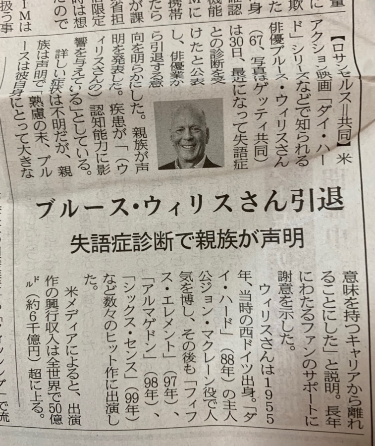 さよならダイハード 2022 3/31 演劇・映画 その他 2022.03.31 いやー明日から新年度だと少々憂うつな気分で夕刊を開くとブルースウィリスさん引退の記事が…。 もうあのアクションは見れない… 学生の頃、ダイハードシリーズは話題に事欠きませんでした。何であんなに不死身なんだろう。 本日の日経夕刊より 失語症で認知に影響、とのことで、もうあの名演技が見られないのは寂しい限りですが、余生を穏やかに満たされて過ごしてほしいです。 演劇・映画 その他 この記事をシェアする 浅草で千本桜 パラサイトイヴ〜葉月里緒菜 関連記事 この世界の片隅で会いたい! 2022.09.06 着付けに四苦八苦〜細雪 2022.03.14 あなたもシャーロキアン@横浜 2022.12.24 ローマの平日〜ジェンダー問題 2022.05.20 青森まで行きたい〜台風クラブ 2022.11.28 日本は沈没しないで〜1973 2022.10.25 退職届だしたら切腹…新撰組 2022.06.10 愛は吐息のように〜トップガン 2022.06.11