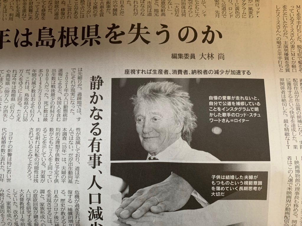 ロッドスチュアートと島根県 2022 4/05 音楽 洋楽 2022.04.05 先日の日経に、ロッドスチュアートが載ってました。 ボクってセクシー? 内容は、公道が傷んでいて、自分のお金を出して直して車を運転している、といった内容でした。 島根県から始まって、何故Rスチュアート… 人口が減った自治体の危機についての記事ですが、ロッドがこんなお爺ちゃんになっていたとは。トホホ…。 雨の表参道 音楽 洋楽 この記事をシェアする 後楽園遊園地でボクと握手! さよならヴィーナスフォート 関連記事 狙われたユーミン50周年おめでと 2022.12.11 バービーボーイズ〜イマサさん 2022.02.16 辛島美登里×聖戦士ダンバイン 2022.10.11 2023年のマリ林〜追悼天沢退二郎 2023.01.29 原田真二×キャンディキャンディ 2023.02.08 祝!橋本環奈ちゃん紅白司会 2022.10.12 「僕大丈夫?」さらば幸宏 2023.01.16 スパイスガールズとデュラン✖️2 2021.12.28