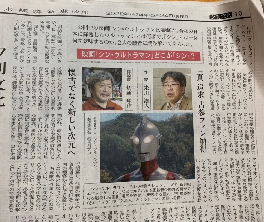賛否両論〜ウルトラマン談義 2022 5/24 アニメ・マンガ オススメ 2022.05.24 ロードショー公開されてから、あちこちで賛否両論ですね。 こんな顔したヒトよく歩いてませんか? 初代を知ってる立場としては、深く考えないで見てオッケーなんじゃないかと…。 今日の日経夕刊 円谷監督へのオマージュ、そして知らない世代へ繋いでいきたい庵野さんの思い、しかと受け止めました。オタク老人万歳。笑 アニメ・マンガ オススメ この記事をシェアする オタクの子はオタク〜莉犬くん としまえんかハリポタか 関連記事 王家の紋章〜話、長くね?(-。-; 2022.10.09 fox capture plan×大森靖子ヤバ 2022.08.22 さよなら藤子不二雄A先生 2022.04.09 すき家とレキシントンクィーン 2022.02.25 中村佑介展×アジカン 2022.11.14 小林七郎さん、さようなら 2022.09.14 3億円奪うか貰うか〜三原陽子さん 2022.08.07 ラーゲリ✖️シンケンジャー🟰桃李 2023.01.04