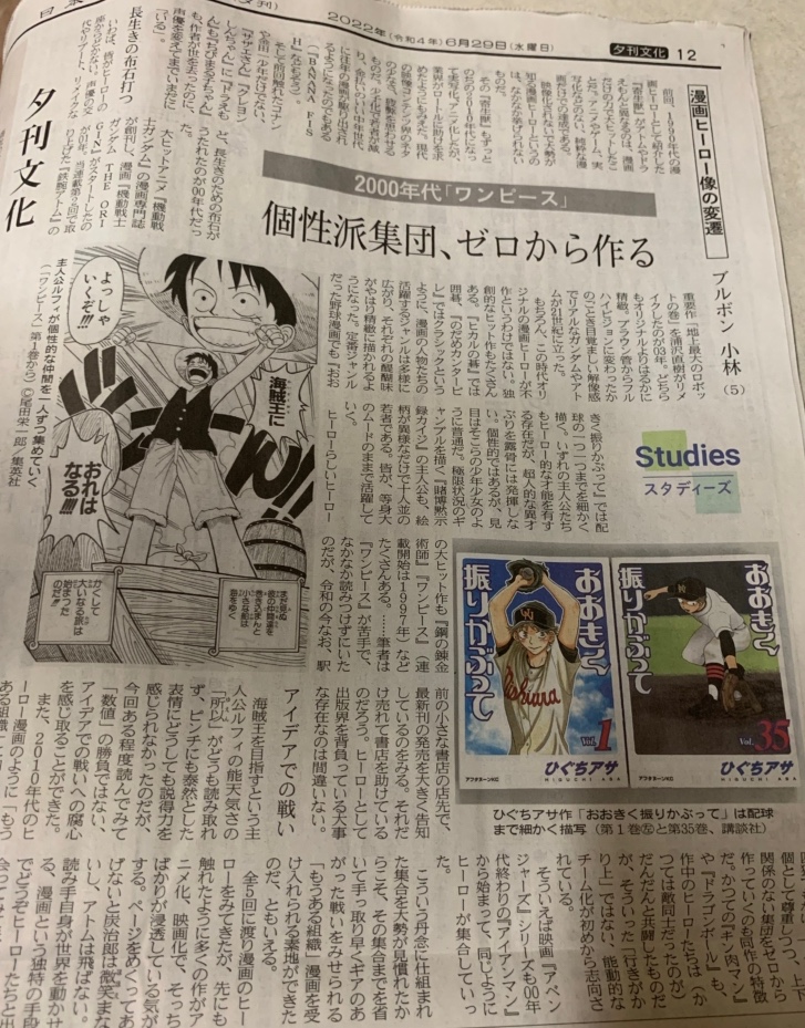 マンガヒーロー像の変遷とは… 2022 6/29 アニメ・マンガ つれづれ その他 2022.06.29 日経夕刊、ビジネスマンのオタクを炙り出そうという… ヒカルの碁、魅力的な人物が多かったです ワンピースのルフィにしても、キン肉マン、ドラゴンボールにしても、力のある個性が上下関係のない集団を一から作っていく作風が時代にマッチしていった、と解釈されています。 アニメかマンガか、と問えば私は勿論マンガ派ですね。単に時間がなくてテレビを観るヒマがないからです。医者の待合室で鬼滅を4巻程読み進めれば、3ヶ月分の時間を得た気分になれるので。 文学にせよ、映画にせよ、一期一会の精神で付き合っています。人生何回あっても足りやしない! ブルボン小林先生、お疲れ様でした アニメ・マンガ つれづれ その他 この記事をシェアする 吾妻ひでお先生とラナ ナイトレンジャーとSFO 関連記事 自虐ネタの始祖〜としまえん 2022.07.31 晴海コミケの思い出 2021.12.30 オタクの子はオタク〜莉犬くん 2022.05.23 東リベ✖️動物園?〜ブームは続く 2022.03.04 レモンハートで乾杯! 2022.04.29 The future we want 〜ロボコ 2023.01.01 救心でボウケンジャー〜高橋光臣 2022.12.17 プリキュアとパッドマン 2022.03.12